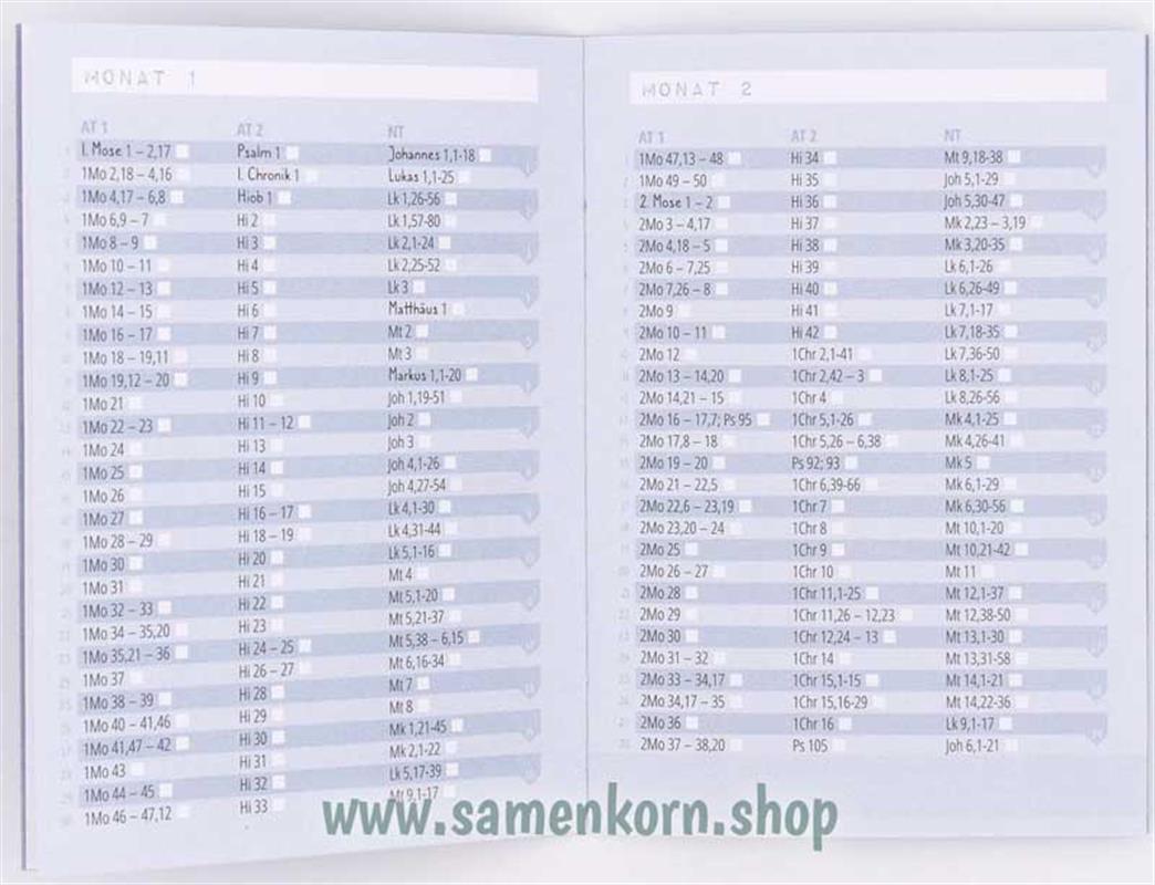 Dieser Bibelleseplan führt wahlweise in 6 Monaten, 1 Jahr, 1,5 Jahren, 2 Jahren, 3 Jahren oder auch ganz frei durch die Bibel und orientiert sich dabei an der zeitlichen Reihenfolge der geschichtlichen Abläufe.