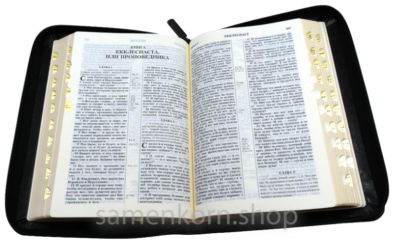 синодальный перевод, в кожаном переплете, с позолоченным срезом, замочком, поисковыми индексами и цветными географическими картами.