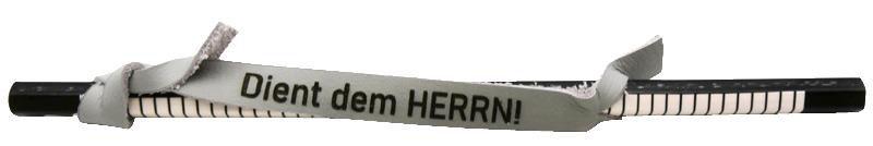 Bleistift mit Notenschlüssel-Motiv und Text "Lobet Gott!" oder "Dient dem Herrn!" auf dem Lederband. Das Lederband kann zu einer Schlaufe zusammengeschoben werden. Dadurch lässt sich der Bleistift gut an einem Haken oder am Notenständer aufhängen. Für den Transport kann das Band wieder auseinandergeschoben werden.