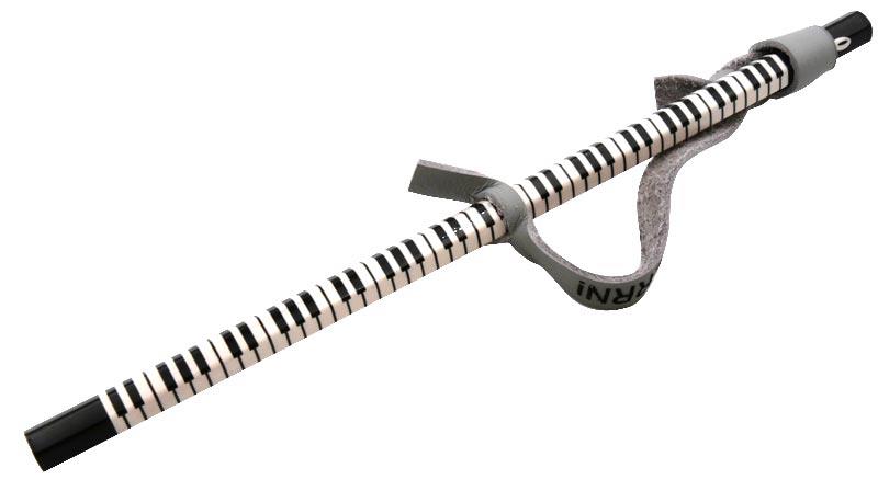 Bleistift mit Klaviertastatur-Motiv und Text "Lobet Gott!" oder "Dient dem Herrn!" auf dem Lederband. Das Lederband kann zu einer Schlaufe zusammengeschoben werden. Dadurch lässt sich der Bleistift gut an einem Haken oder am Notenständer aufhängen. Für den Transport kann das Band wieder auseinandergeschoben werden.