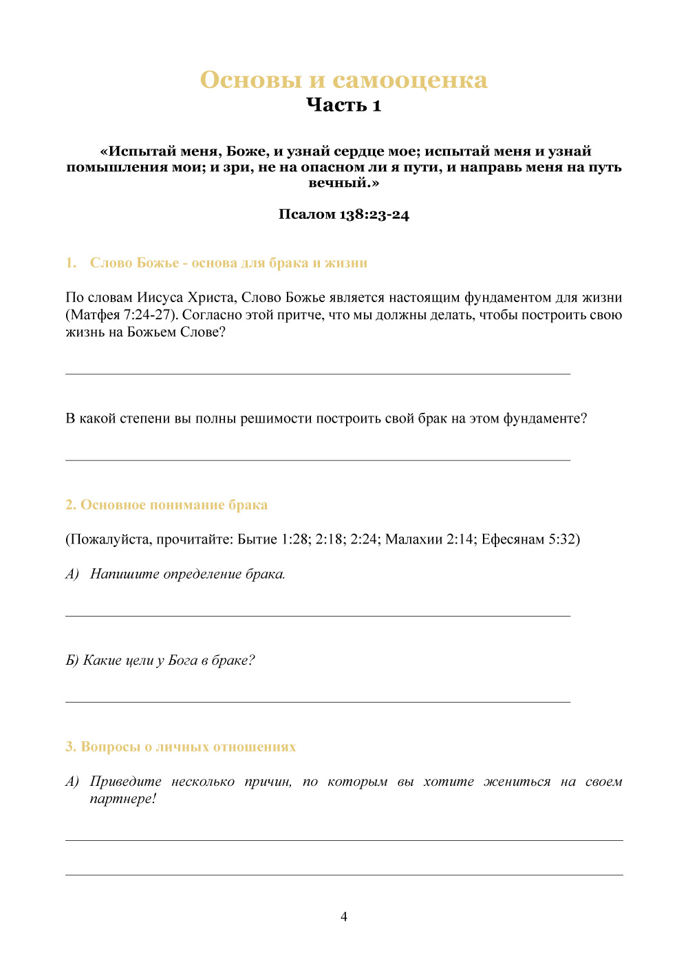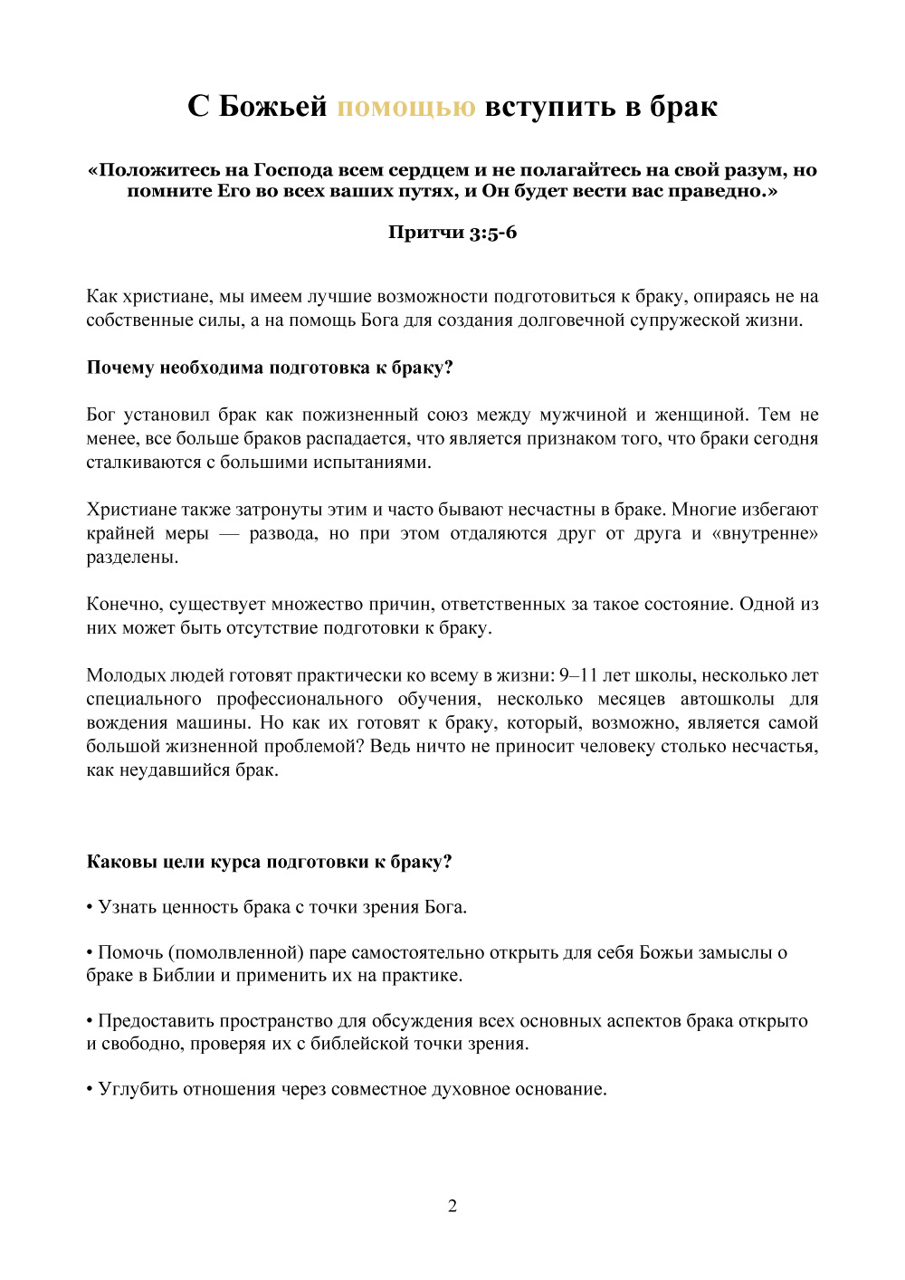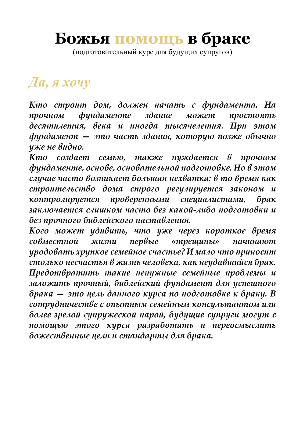 Заложить прочный, библейский фундамент для успешного брака — это цель данного курса по подготовке к браку. В сотрудничестве с опытным семейным консультантом или более зрелой супружеской парой, будущие супруги могут с помощью этого курса разработать и переосмыслить божественные цели и стандарты для брака.
