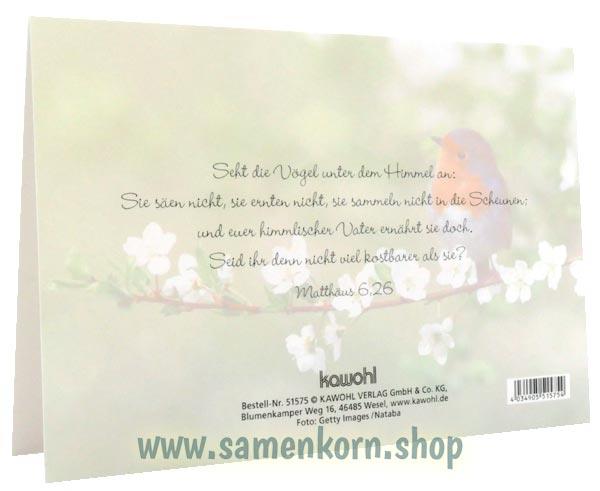 Mit Bibelvers auf der Rückseite: "Seht die Vögel unter dem Himmel an: Sie säen nicht, sie ernten nicht, sie sammeln nicht in die Scheunen; und euer himmlischer Vater ernährt sie doch. Seid ihr denn nicht viel kostbarer als sie? Matthäus 6,26"