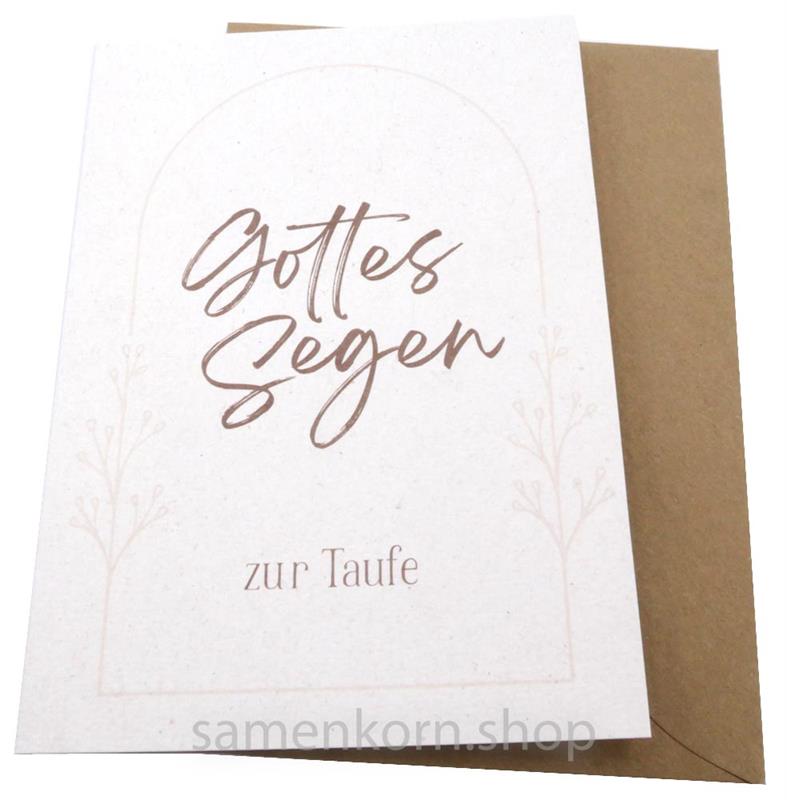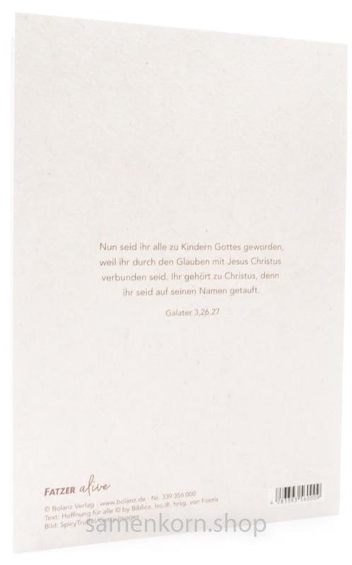 Die Vorderseite trägt die herzliche Botschaft „Gottes Segen zur Taufe“, umrahmt von dezenten Zweigverzierungen, die der Karte eine harmonische und hochwertige Optik verleihen. Auf der Rückseite ist der Bibelvers aus Galater 3:26-27 abgedruckt: „Nun seid ihr alle zu Kindern Gottes geworden, weil ihr durch Glauben mit Jesus Christus verbunden seid. Ihr gehört zu Christus, denn ihr seid auf seinen Namen getauft.“