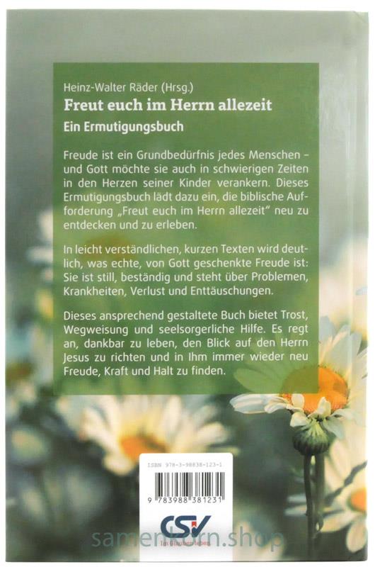 Freude ist ein Grundbedürfnis jedes Menschen – und Gott möchte sie auch in schwierigen Zeiten in den Herzen seiner Kinder verankern. Dieses Ermutigungsbuch lädt dazu ein, die biblische Aufforderung „Freut euch im Herrn allezeit“ neu zu entdecken und zu erleben.
