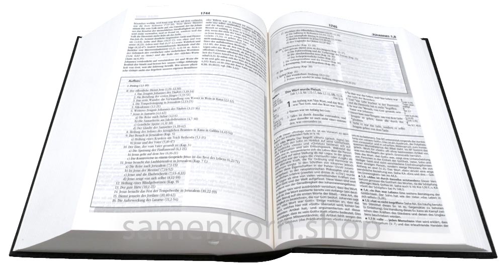 - eine Randspalte mit einem kompletten Kreuzverweissystem, mit Verweisen auf Parallelstellen, alternative Übersetzungsvarianten etc.