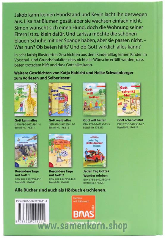 In acht farbig illustrierten Geschichten aus dem Kinderalltag lernen Kinder im Vorschul- und Grundschulalter, dass nicht alle Wünsche erfüllt werden, dass beten trotzdem hilft und dass Gott alles kann.