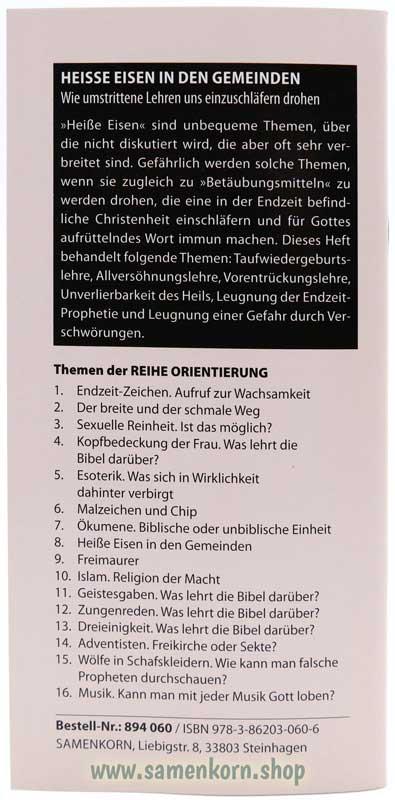 Dieses Heft behandelt folgende Themen: Taufwiedergeburtslehre, Allversöhnungslehre, Vorentrückungslehre, Unverlierbarkeit des Heils, Leugnung der Endzeit-Prophetie und Leugnung einer Gefahr durch Verschwörungen.