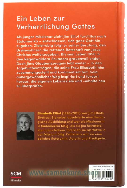 Jim Elliot ging einen außergewöhnlichen Weg: Als junger Missionar zieht er furchtlos nach Südamerika - entschlossen, sich ganz Gott hinzugeben. Zielstrebig folgt er seiner Berufung, den Auca-Indianern die rettende Botschaft von Jesus Christus weiterzugeben. Bis sein junges Leben 1956 in den Regenwäldern Ecuadors grauenvoll endet. Doch Jims Glaubenszeugnis lebt weiter. In diesem Buch hat seine Frau Elisabeth seine Tagebucheinträge zusammengestellt und kommentiert. Sein Weg inspiriert und fordert heraus, die eigenen Lebensziele und -inhalte neu zu überprüfen.