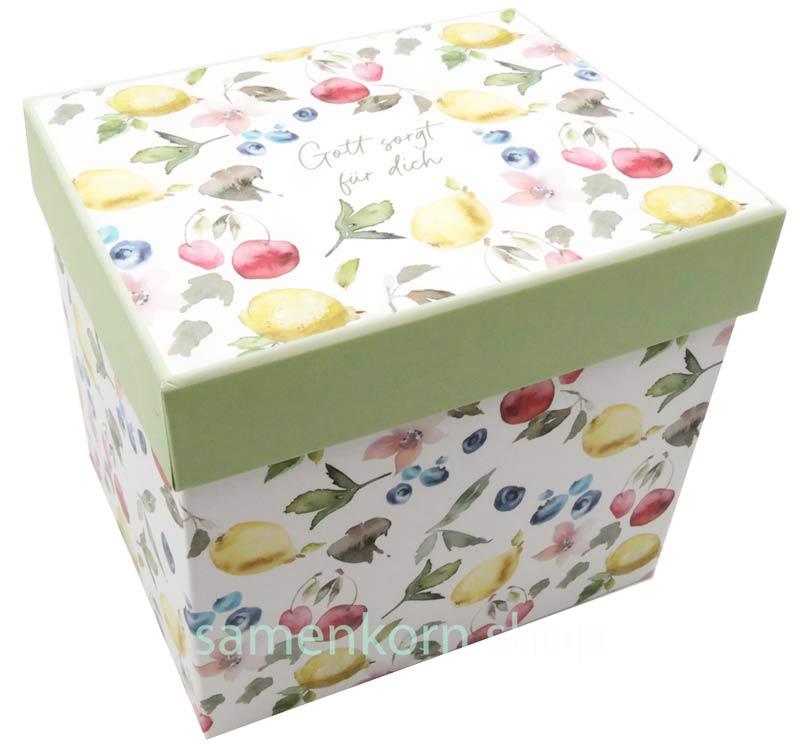 Entdecke die Jumbotasse "Gott sorgt für dich" aus hochwertigem Porzellan. Sie begeistert mit einem frischen Früchte-Design aus leuchtenden Zitronen, saftigen Kirschen und süßen Blaubeeren. Mit der Aussage "Gott sorgt für dich" bringt sie direkt gute Laune in deinen Alltag und erinnert dich daran, dass Gott immer auf dich achtet.