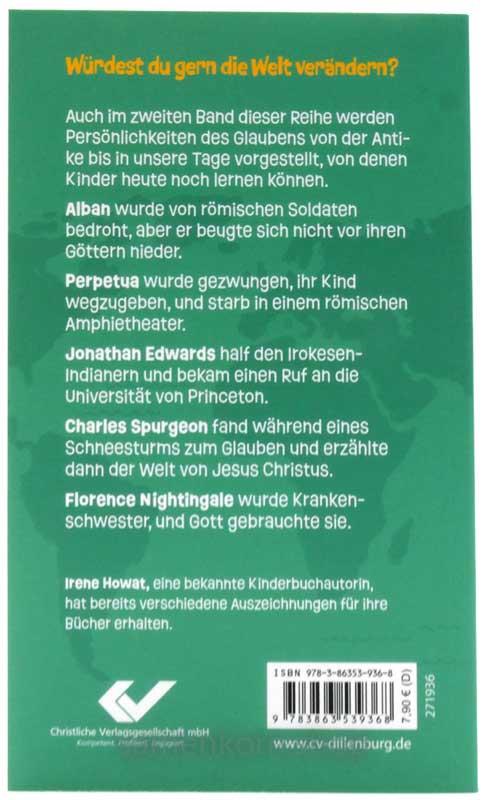 Auch im zweiten Band dieser Reihe werden wieder Persönlichkeiten des Glaubens von der Antike bis in unsere Tage vorgestellt, von denen Kinder heute noch lernen können. Alban wurde von römischen Soldaten bedroht, aber er beugte sich nicht vor ihren Göttern nieder. Perpetua wurde gezwungen, ihr Kind wegzugeben, und starb in einem römischen Amphietheater. Jonathan Edwards half den Irokesen-Indianern und bekam einen Ruf an die Univiersität von Princeton. Charles Spurgeon fand während eines Schneesturms zum Glauben und erzählte dann der Welt von Jesus Christus. Florence Nightingale wurde Krankenschwester, und Gott gebrauchte sie.