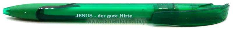 Druckkugelschreiber mit auffälliger, ergonomischer Griffzone und breitem, doppelt geschwungenem Kunststoffklipp. Auf dem transparenten Gehäuse ist der Text aufgedruckt "Jesus - der gute Hirte". Sehr gut zu Verteilzwecken oder Kinderarbeit geeignet.