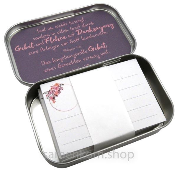 Die Prayerbox bietet dir eine gute und hilfreiche Möglichkeit, Gebetsanliegen zu sammeln und aufzubewahren. Du kannst deine Sorgen, bitten und Danken, vielleicht auch ein Datum, erhörte Gebete und vieles mehr notieren. So kannst du sehr konkret beten und Gebetsanliegen nicht vergessen.