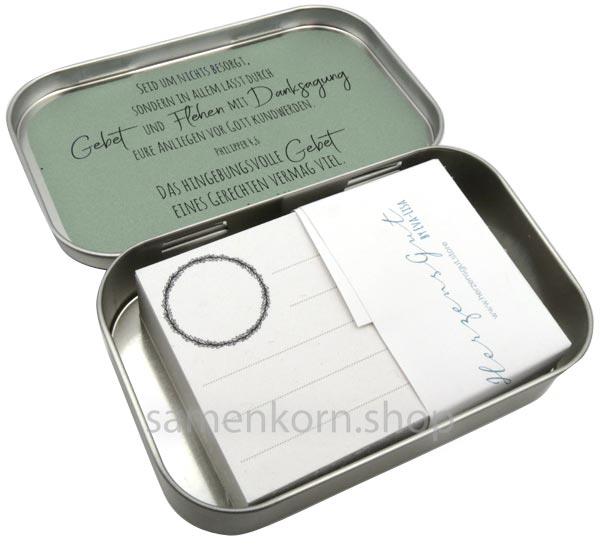 Die Prayerbox bietet dir eine gute und hilfreiche Möglichkeit, Gebetsanliegen zu sammeln und aufzubewahren. Du kannst deine Sorgen, bitten und Danken, vielleicht auch ein Datum, erhörte Gebete und vieles mehr notieren. So kannst du sehr konkret beten und Gebetsanliegen nicht vergessen.