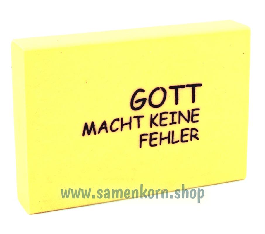 Radiergummi in knalligen Neonfarben, bedruckt mit "Gott macht keine Fehler", ca. 4,5x3 cm