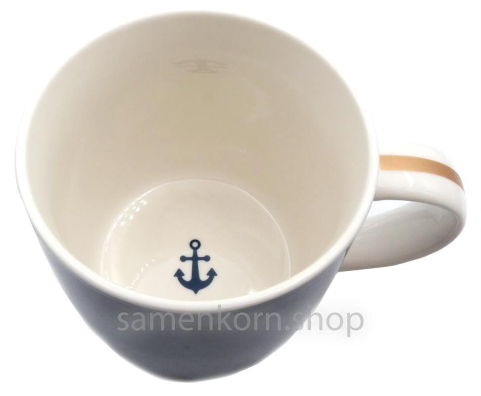 Die Details sind kupferfarben mit Metallic-Effekt auf edlem dunkelblau. Als besonderen Clou findet sich ein kleiner Anker auf dem Tassen-Innenboden. Die Tasse ist aus Porzellan, Höhe 9 cm, ca. 0,35 l, spülmaschinengeeignet. Verpackt in passender Geschenkbox, die sich prima zum Sammeln von Kleinigkeiten eignet und ist ein schöner Blickfang.