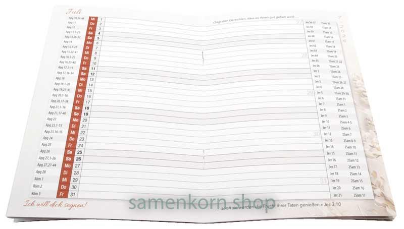 Eine Doppelseite pro Monat bietet Raum für Notizen. Außerdem ist auf der gleichen Doppelseite ein Bibelleseplan mit Bibelstellen in drei Spalten abgedruckt. Vor den Monatsübersichten gibt es eine Jahresgesamtübersicht und eine Übersicht für Feiertage und Schulferien.