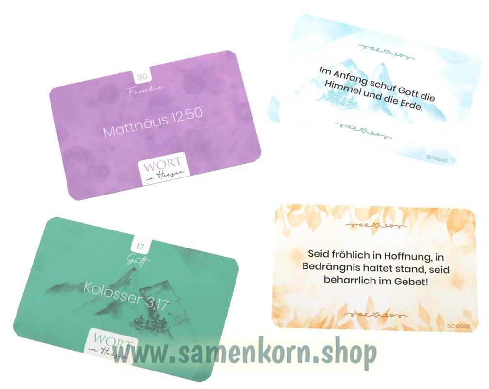 Ein hilfreiches und praktisches Kartensystem, das das organisierte Erlernen ausgewählter Bibelverse (Schlachter 2000) effektiv unterstützt. Auf der einen Seite ist der Vers und auf der anderen Seite die Bibelstelle abgedruckt. Die Karten sind auf 6 verschiedene Themen aufgeteilt, pro Thema sind es 8 Karten. Die Themen sind Gebet, Wort Gottes, Gott, Familie, Evangelium und christliches Leben.