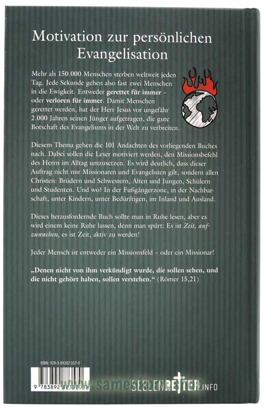 Diesem Thema gehen die 101 Andachten des vorliegenden Buches nach. Dabei sollen die Leser motiviert werden, den Missionsbefehl des Herrn im Alltag umzusetzen. Es wird deutlich, dass dieser Auftrag nicht nur Missionaren und Evangelisten gilt, sondern allen Christen: Brüdern und Schwestern, Alten und Jungen, Schülern und Studenten. Und wo? In der Fußgängerzone, in der Nachbarschaft, unter Kindern, unter Bedürftigen, im Inland und Ausland.