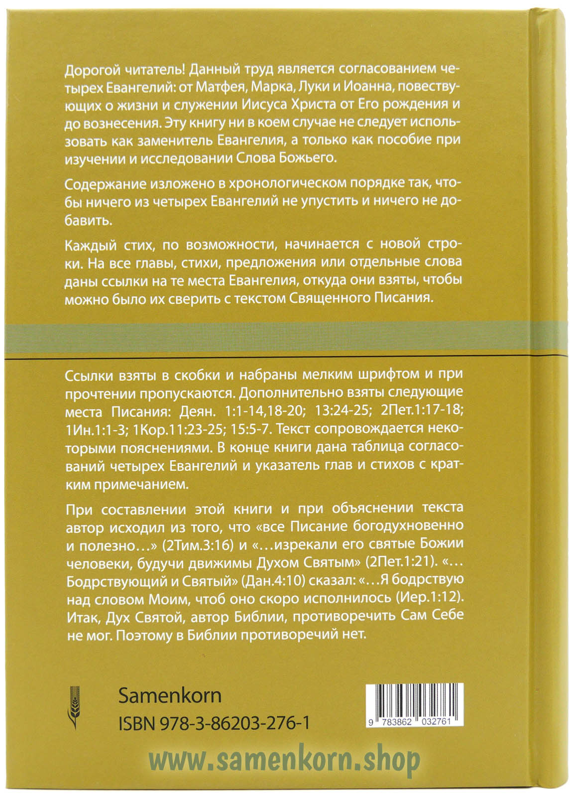 Этот труд является согласованием четырех Евангелий, повествующих о жизни и служении Господа Иисуса Христа от Его рождения и до вознесения. Книгу ни в коем случае не следует использовать как заменитель Евангелия, а лишь как пособие при изучении и иссдедовании Слова Божьего.