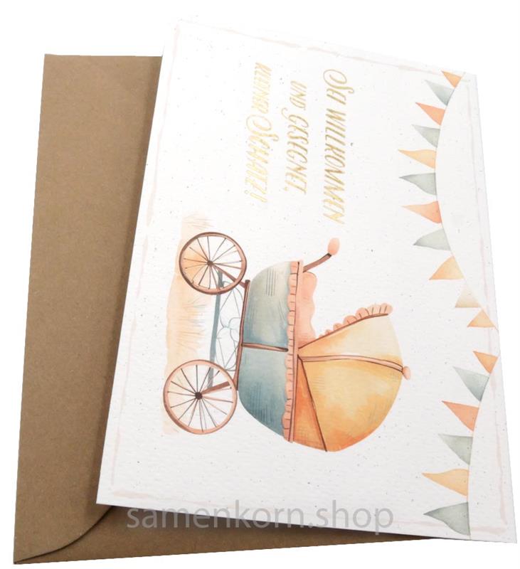 Niedliche Faltkarte zur Geburt mit Segenswünschen mit dem Text „Sei willkommen und gesegnet, kleiner Schatz!“