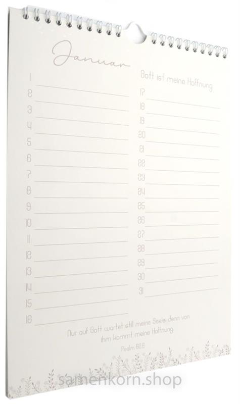 Ein schlichter und liebevoll gestalteter Geburtstagskalender mit ermutigenden Bibelversen (Schlachter 2000), die uns daran erinnern, was Gott für uns ist.