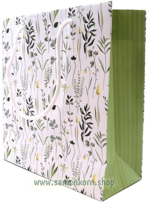 Wiederverwendbare Papiertasche in weiß mit grünem Muster, mit Kordeln, kartonverstärktem Randumschlag und Kartonboden, farbig bedruckt, Vorder- und Rückseite identisch bedruckt.