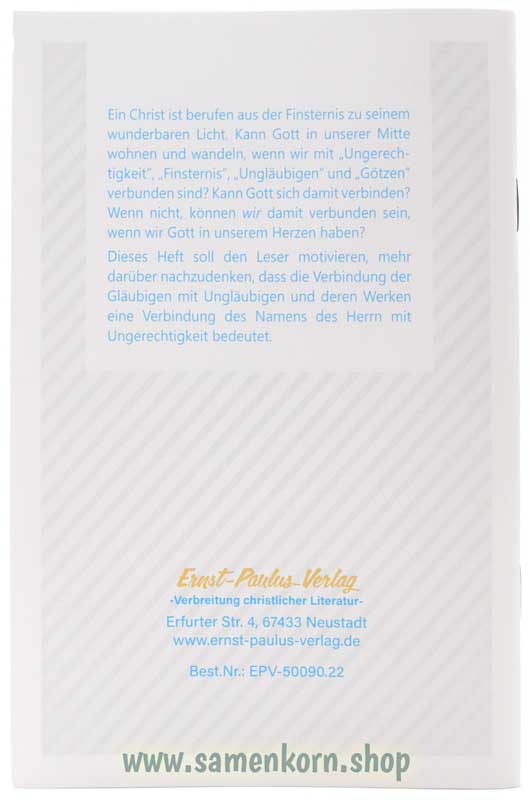 Dieses Heft soll den Leser motivieren, mehr darüber nachzudenken, dass die Verbindung der Gläubigen mit Ungläubigen und deren Werken eine Verbindung des Namens des Herrn mit Ungerechtigkeit bedeutet.
