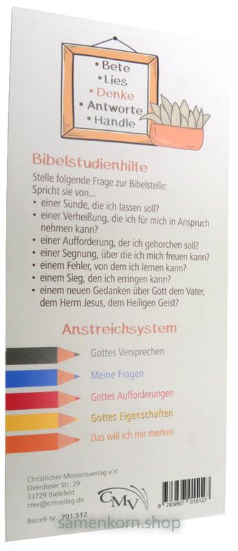 Das Lesezeichen enthält auf der einen Seite die Bücher der Bibel und auf der anderen Seite eine Bibelstudienhilfe sowie ein Anstreichsystem, dessen Farben auf die "Bibel-Markierstifte mit System" vom Bibellesebund abgestimmt sind.
