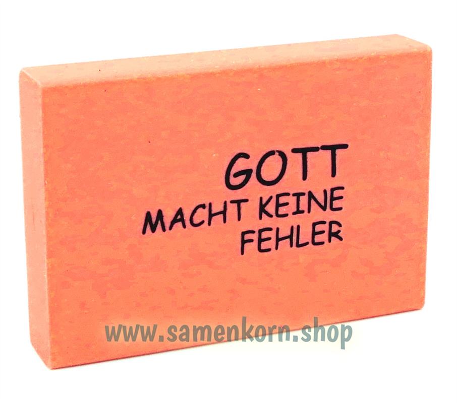 Radiergummi in knalligen Neonfarben, bedruckt mit "Gott macht keine Fehler", ca. 4,5x3 cm