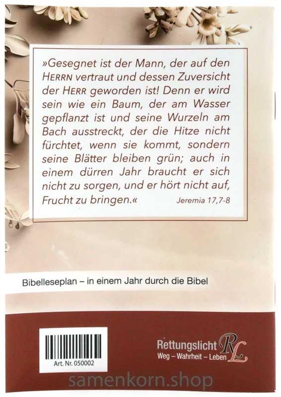 Eine Doppelseite pro Monat bietet Raum für Notizen. Außerdem ist auf der gleichen Doppelseite ein Bibelleseplan mit Bibelstellen in drei Spalten abgedruckt. Vor den Monatsübersichten gibt es eine Jahresgesamtübersicht und eine Übersicht für Feiertage und Schulferien.